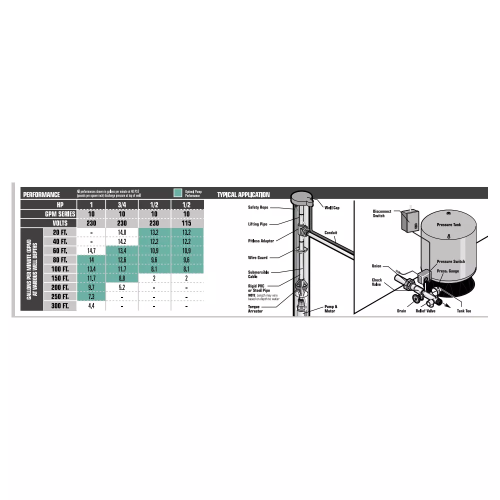 The CountyLine 1/2 HP 4 in. Electric Powered 2-Wire 10 GPM Series Submersible Pump is ideal for residential water systems and agricultural applications to 150 ft. depth to water or less. Featuring a floating stack impeller design for sand resistance and reduced sand locking, this heavy-duty stainless steel pump is built to last. The pump is rated for 115V and is CSA approved.- 1/2 HP