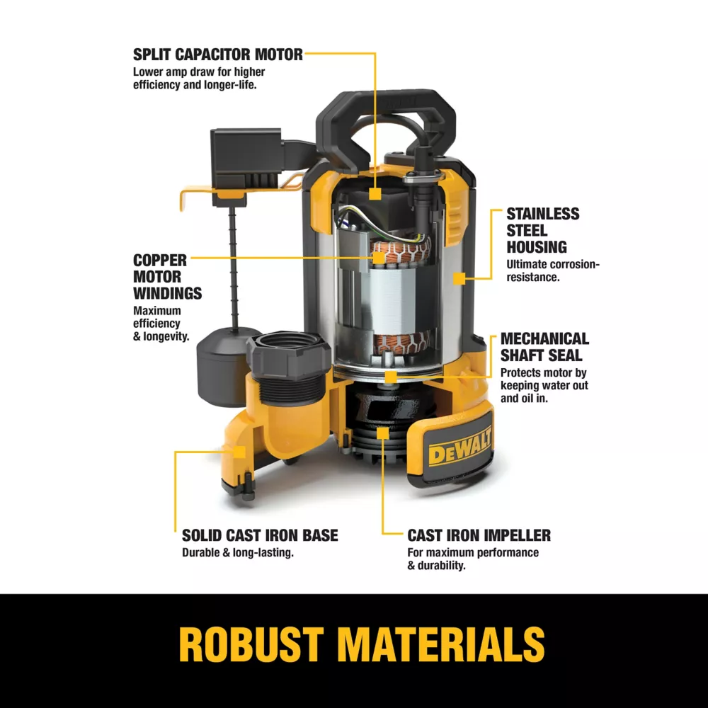 DeWALT 1/3 HP 115V Electric Sump Pump 75 GPM Stainless Steel/Cast Iron Submersible Vertical Switch Sump Pumps Farm & Ranch