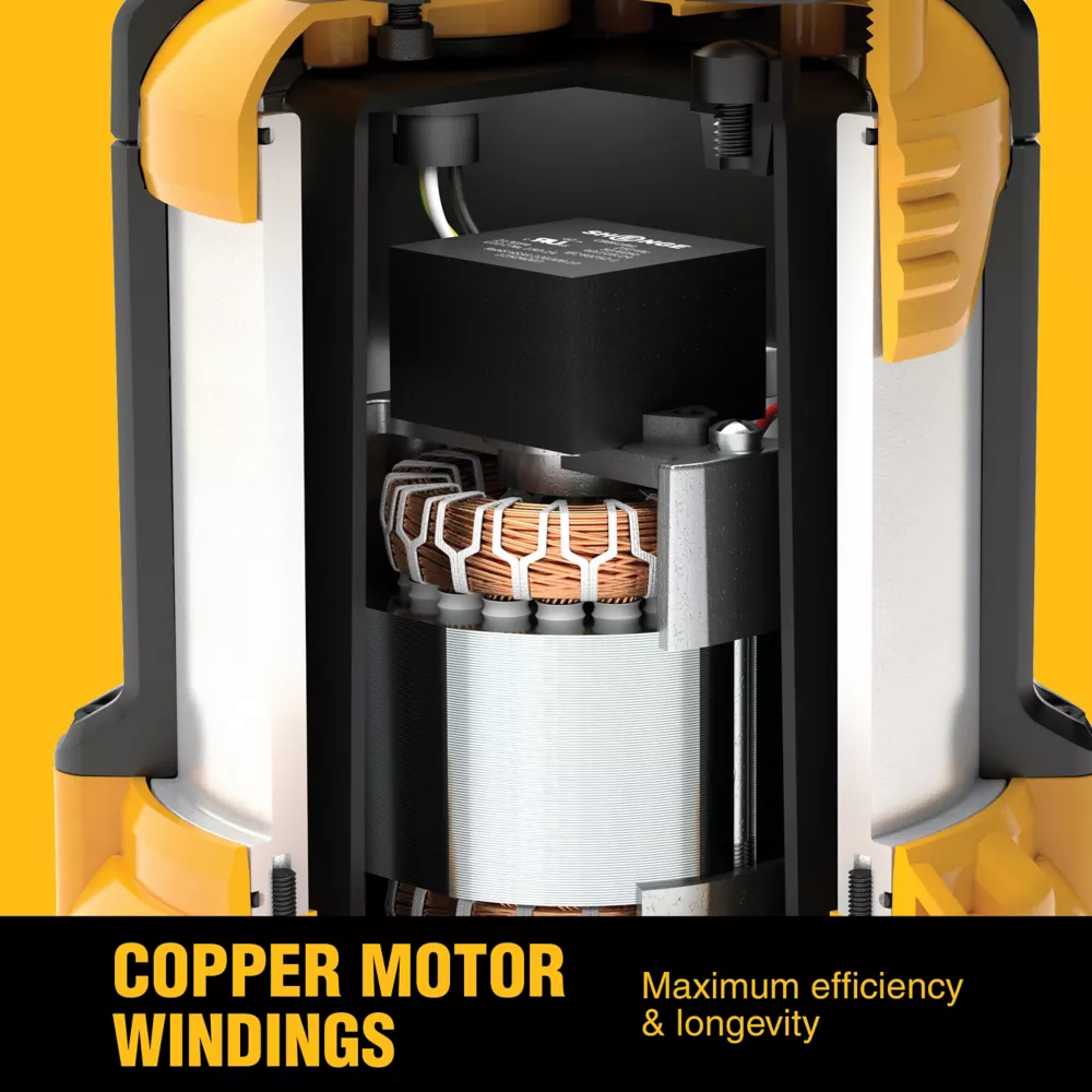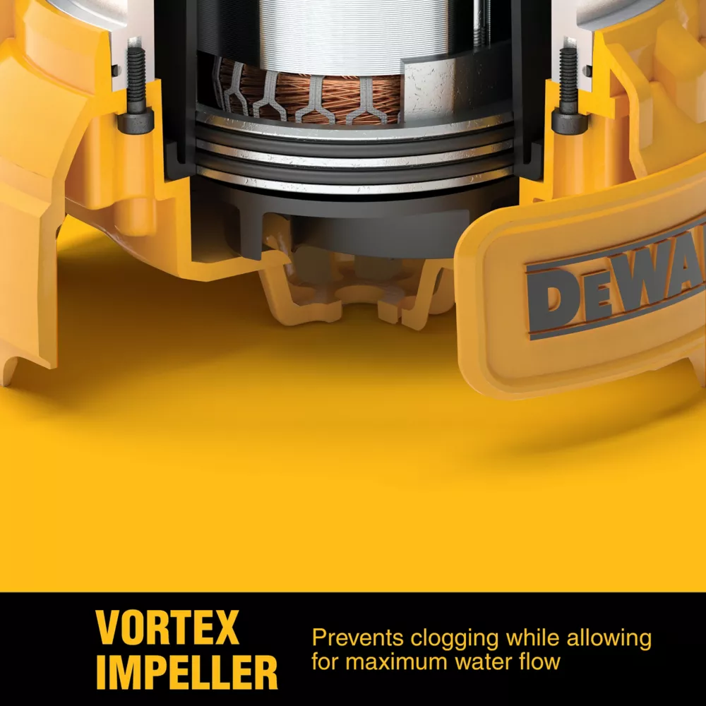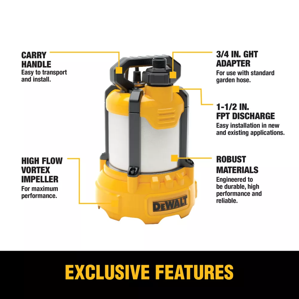 DEWALT Submersible Utility Pumps are GUARANTEED TOUGH to meet and exceed the expectations of experienced trade professionals and homeowners alike. This heavy-duty 1/3 horsepower utility pump easily removes water from flooded basements, job sites, pools, hot tubs and many other water removal applications. DEWALT Utility Pumps are built using the highest quality components including corrosion resistant cast aluminum housing and base, 100% copper motor windings for a long-lasting motor, and a durable 20-foot power cord. DEWALT Utility Pumps have a 1-1/2-inch FPT discharge and include a 3/4-inch garden hose adapter. The 1/3 horsepower DEWALT Utility Pump will pump up to 60 gallons per minute / 3600 gallons per hour and up to a maximum vertical lift of 35 feet. DEWALT Pumps are 100% factory-tested and backed by a 10-year warranty.- Pumps up to 60 gallons per minute / 3600 gallons per hour and up to a maximum vertical lift of 35 feet