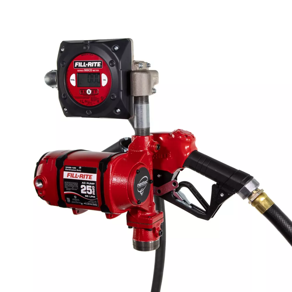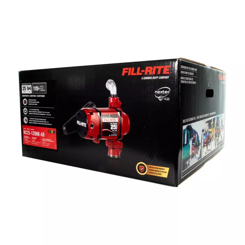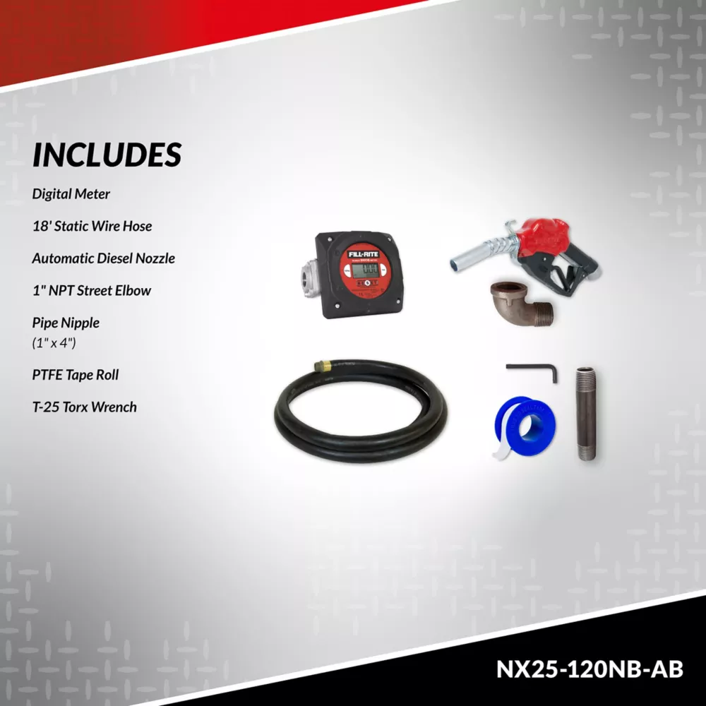 The NX25-120NB-AB model is a 120V AC, 25 GPM premiere fuel transfer pump. This pump and accessory bundle comes complete with a meter, hose, nozzle, and installation components.- Unmatched Performance - Pumps 25% faster, eliminating hours of costly driver downtime while filling up equipment