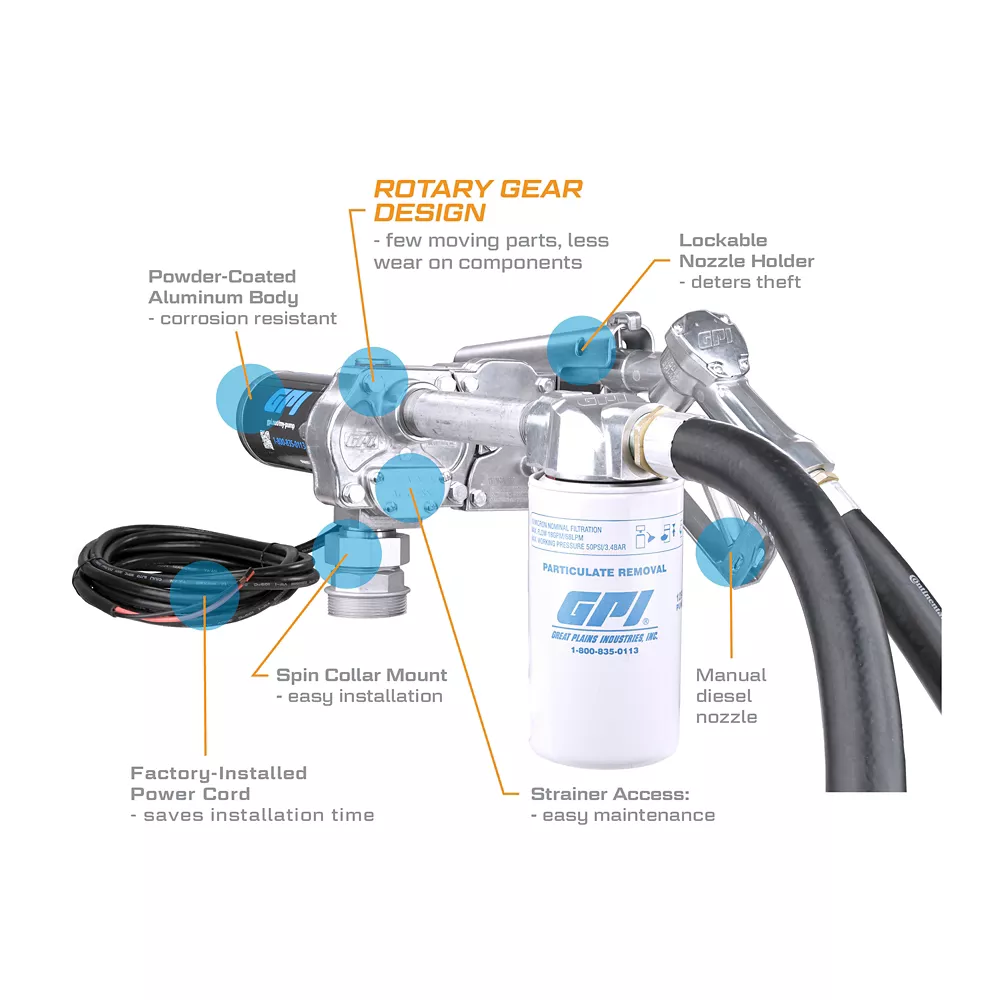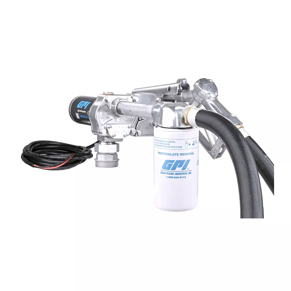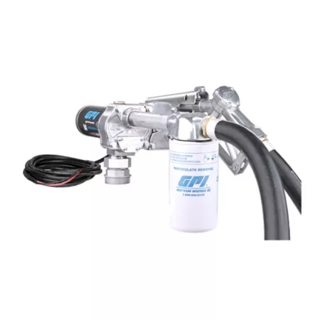 As a GPI best-seller, GPI 12V 18 GPM M-180S-ML Fuel Transfer Pump with Filter provides longer run times and reliable performance year-over-year. It's the pump of choice for agricultural, automotive and construction applications dispensing gasoline, diesel fuel, and kerosene with flow rates up to 18 GPM (68 LPM). The fuel pump features a self-priming rotary gear design, a 12VDC motor, and a lightweight cast aluminum body that resists corrosion. The included 18 GPM (68 LPM) particulate filter kit with 10 micron nominal filtration to remove fuel contaminants that can damage your equipment. This GPI fuel transfer pump and filter combo is UL listed and comes with a manual leaded nozzle, a telescoping suction pipe to fit tank depths between 15 in. and 40 in., convenient spin collar for easy installation, a lockable nozzle holder to deter theft, a fuel dispensing hose, and a factory-installed, 18 ft. (5.5 m) power cord.- Fuel transfer pump includes an 18 GPM 10 micron, 1-12 UNF particulate filter that removes debris from fuel that may damage your equipment