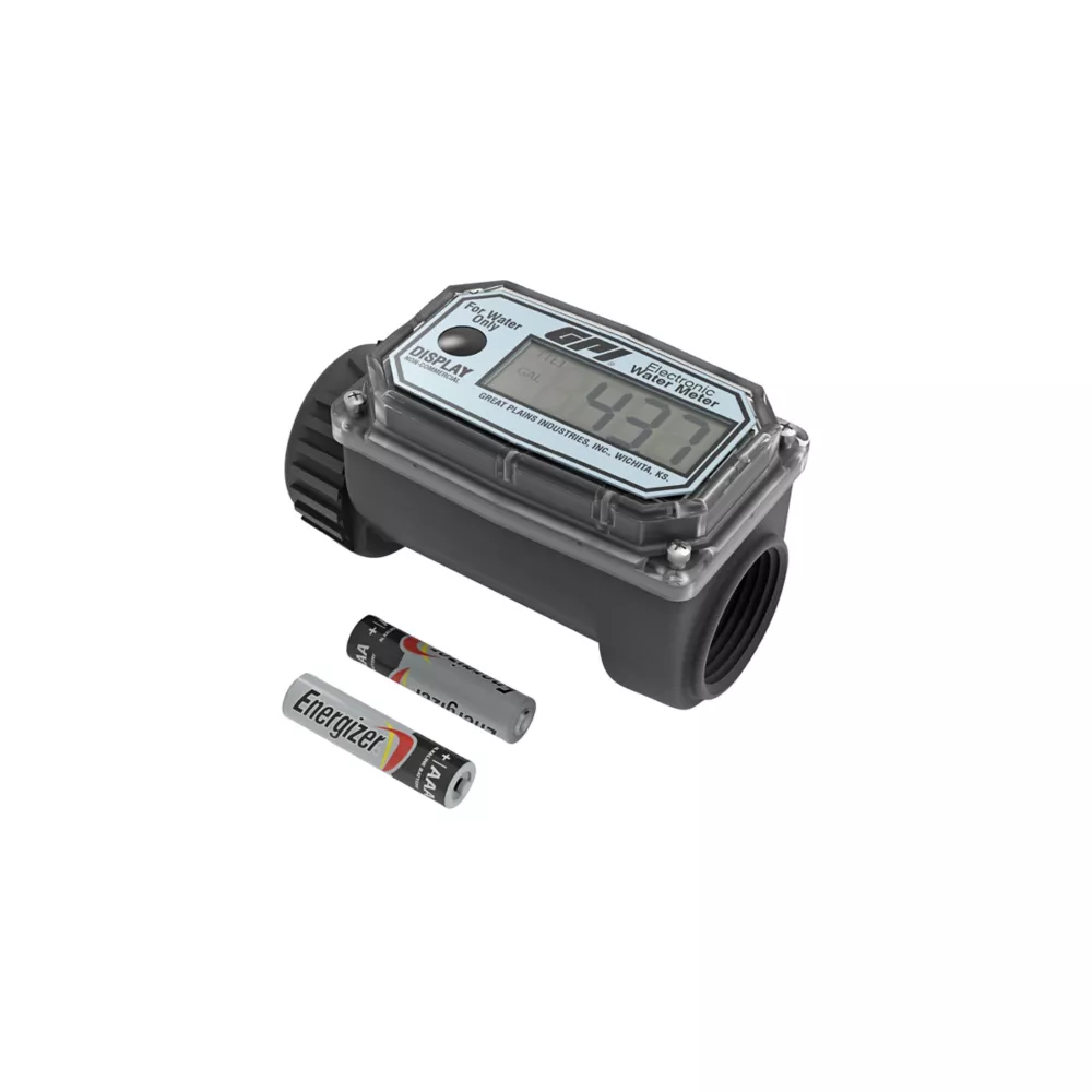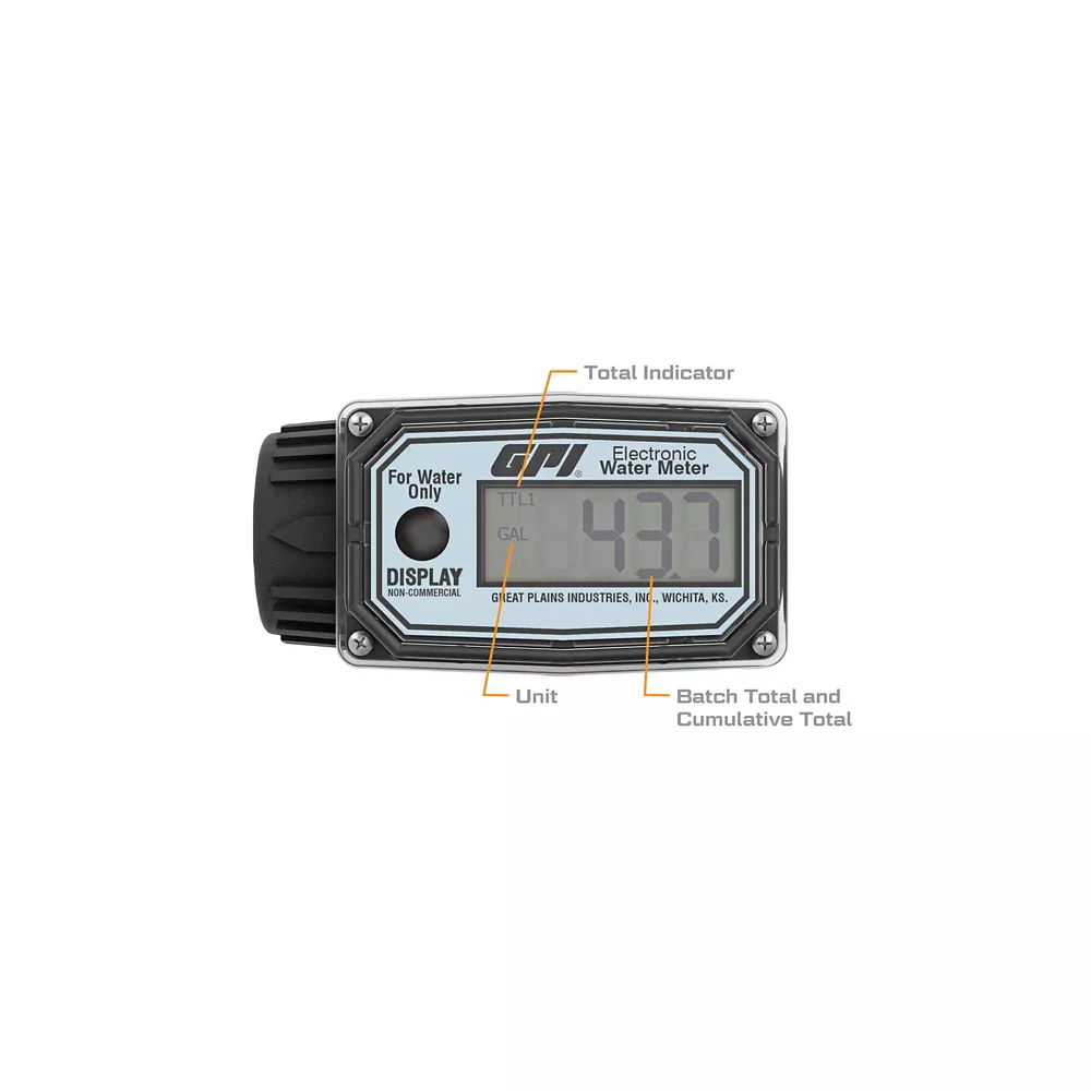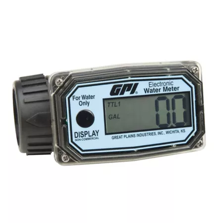 The GPI 3-30 GPM 1 in. Digital Water Meter is made from durable nylon and features an LCD display that is accurate to +/-5 percent of reading. This economical turbine meter is designed for flow rates from 3 to 30 GPM and is factory-calibrated in gallons for use with water. The lightweight digital water meter mounts easily to the end of a hose and is ideal for use with free flow gravity systems or combined with an electric transfer pump as part of an irrigation or water management system. The digital flow meter has 1 in. FNPT inlet/outlet and comes with two standard AAA alkaline batteries with two-year life.- Compact and lightweight digital water meter weighs just 12 oz.