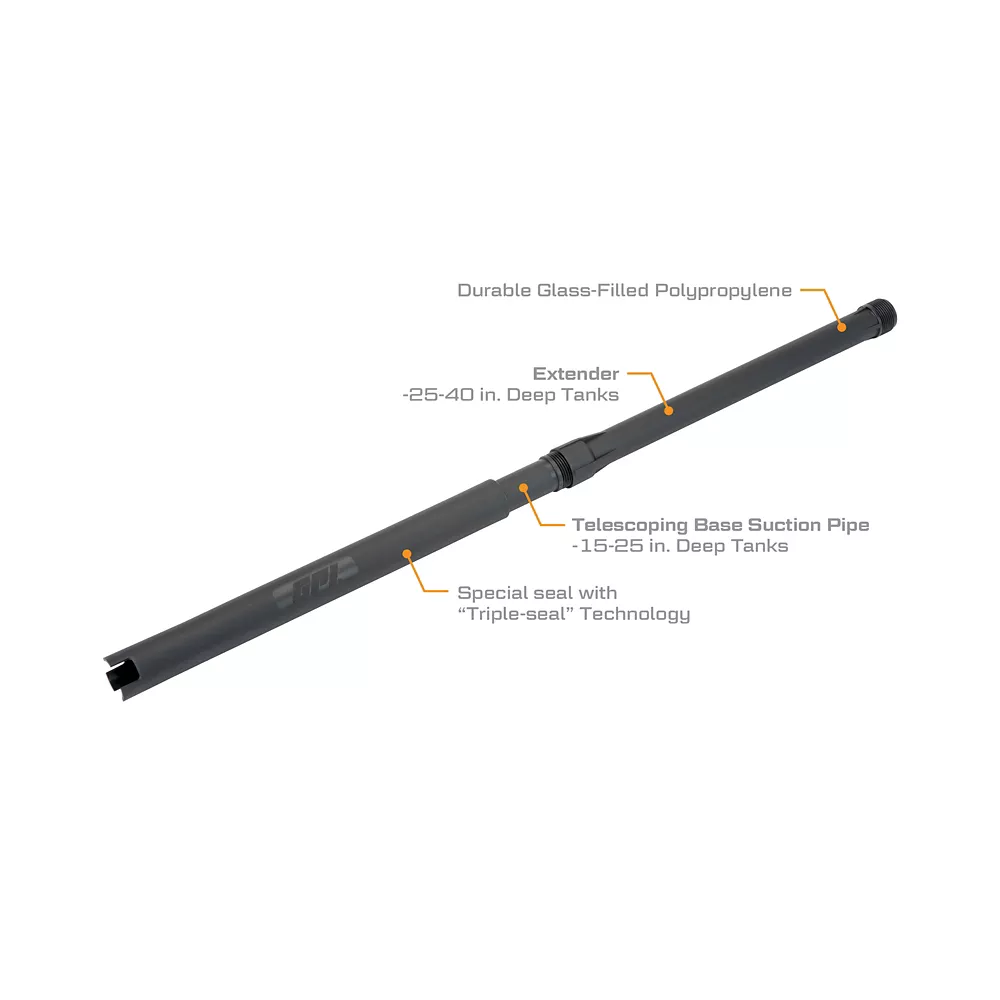 The GPI Suction Pipe Assembly with Triple Seal technology adjusts from 15 in. to 40 in. to fit most standard tank sizes. A solid polyethylene construction of the tank suction pipe provides durability and corrosion resistance. Use fuel tank suction pipe with GPI Electric Pumps and Hand Pumps with a 1 in. inlet to transfer gasoline, diesel and kerosene.- 15 in. to 40 in. adjustable plastic tank suction pipe