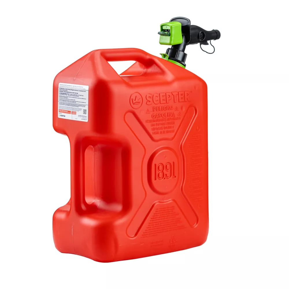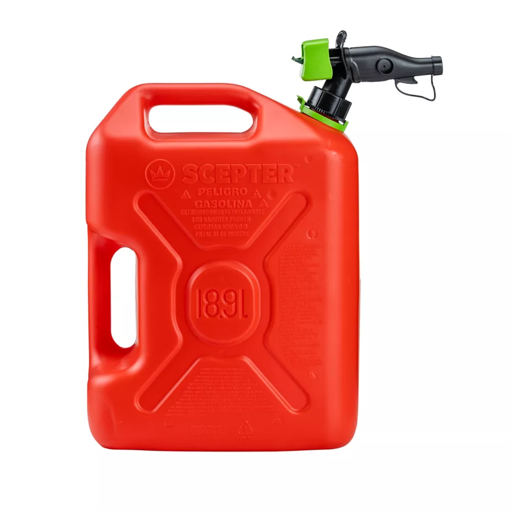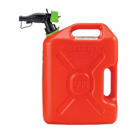 The Scepter 5 gal. Military Style Gas Can with FMD and Rear Handle is great for the outdoors. New and improved rear handle is easier for consumers to handle full 40-50 lb. of fuel. Another addition is the SmartControl spout, the #1 rated consumer experience that's easy to pour. Just squeeze. It's the fastest fill without spills with a controllable flow rate. Pour a little or a whole tank- Military inspired styling great for outdoors
