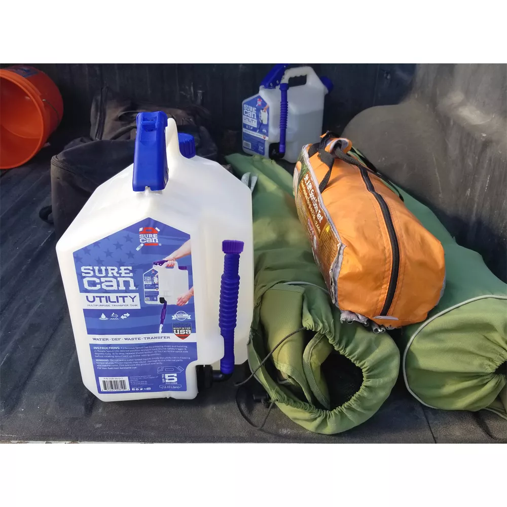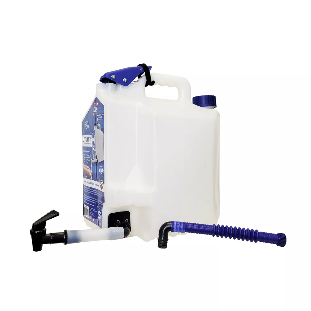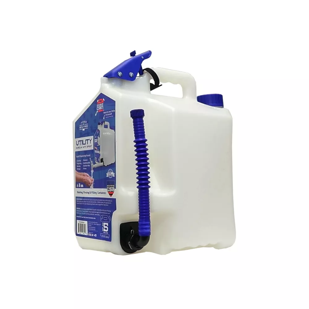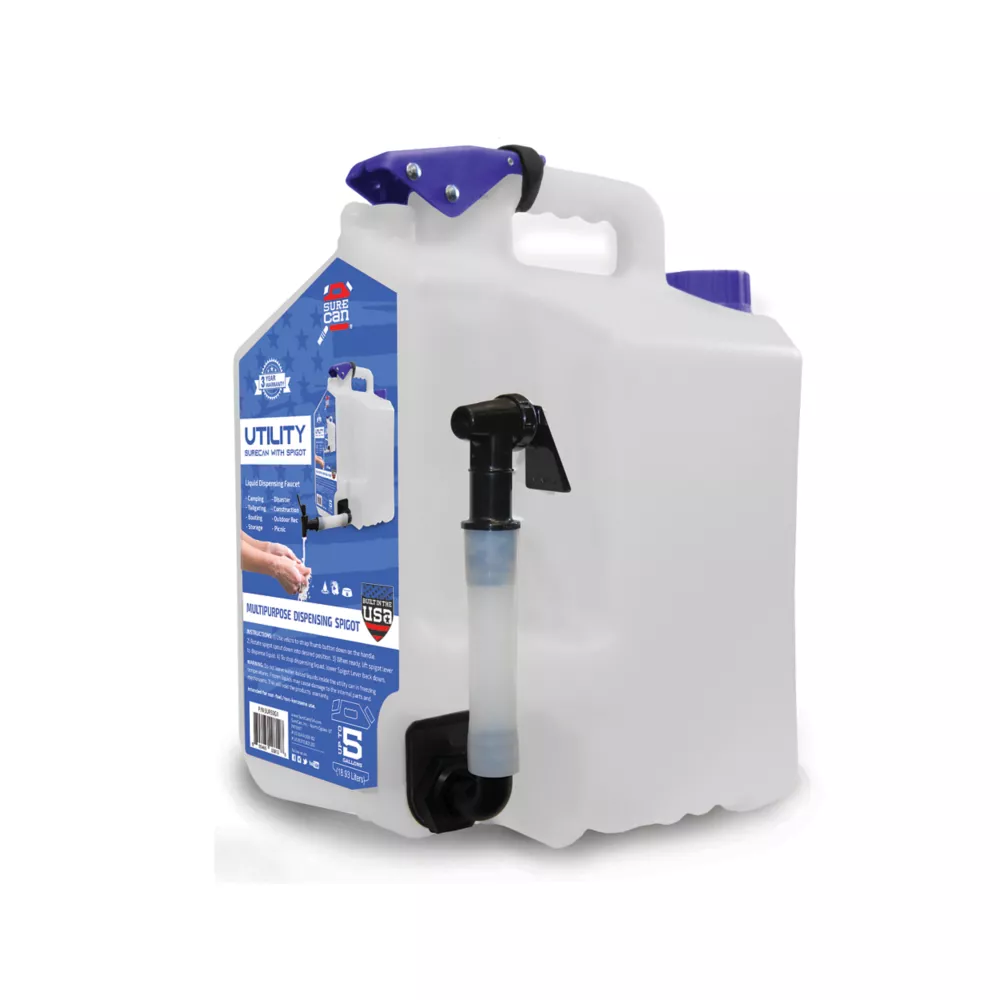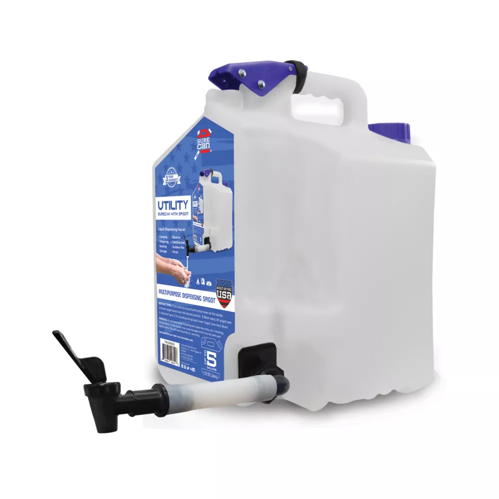The SureCan 5 gal. Utility Surecan with Interchangeable Spigot and Spout is the most versatile all-purpose water jug on the market. Built with our innovative bottom feed technology and legendary toughness, the rotating spigot provides a fast, convenient dispensing experience that is unmatched! This utility can comes with both a spigot and a spout that easily switch out to make it even more versatile. BPA-free with all food-grade materials make it safe for storing and easily dispensing liquids. This can is perfect for drinking water, washing hands, rinsing food or objects, filling pet bowl and many other applications. Its durable HDPE construction offers long-lasting use.- BPA-free