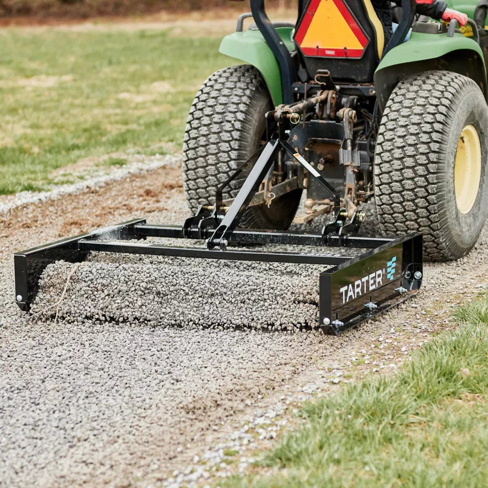 The Tarter 4.5 ft. 100 Series Land Grader has a Limited Category 1 hitch that fits most sub-compact tractors. It features adjustable skid shoes and updated angle and spacing of the dual cutting blades for enhanced material flow. The updated design also boasts a heavier frame construction than previous models. All Tarter Land Graders come with two 3/8x6 high carbon heat-treated blades that are reversible and replaceable.- Tractor Horsepower: 18-30