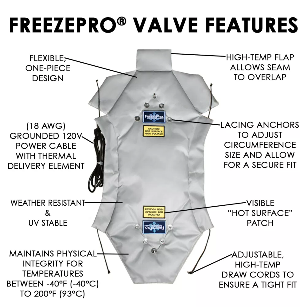 The UniTherm 12 in. x 18 in. FreezePro Heat Trace Pipe Freeze Protection Valve Insulation Jacket delivers a barrier of uniform, directional heat where it is needed most - to tanks, pipelines, drums, buckets, IBC totes, and other temperature sensitive equipment. The advanced, all-in-one design of this valve insulation jacket eliminates the need for multiple product purchases and simplifies the entire implementation process while saving time and money. The end result is an efficient heating solution with the most cost-effective method for minimizing damage caused by harsh or freezing temperatures. This valve insulation jacket is designed to fit closely with tight joints on complex shapes, such as valve fittings, strainers, T or Y joints, or the like.- Valve insulation jacket is used to protect key components from freezing and help prevent costly damage from occurring