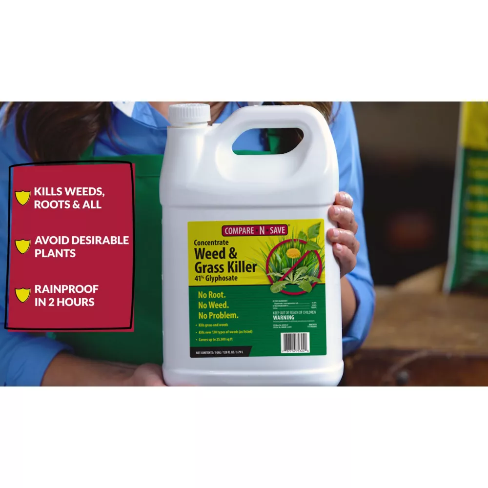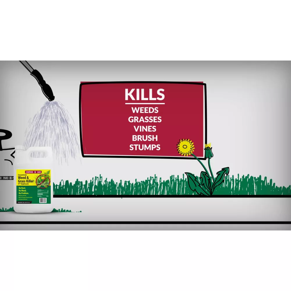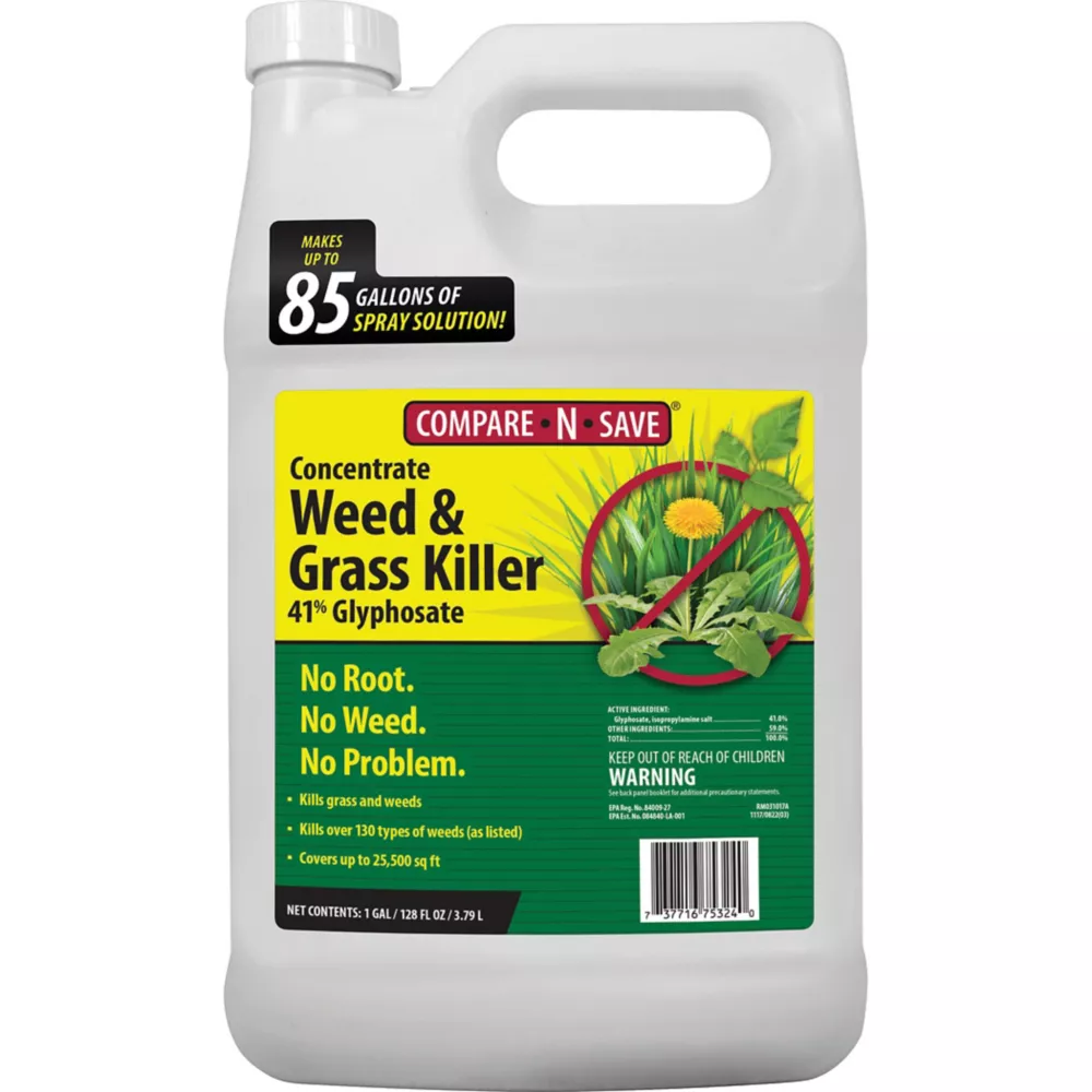 Get to the root and kill grass and weeds with Compare-N-Save 1 gal. 41% Glyphosate Grass and Weed Killer Concentrate. Use this weed and grass killer concentrate for lawn or garden replacement, on patios, walkways, or in and around fences and gardens to remove unwanted grass and provide weed prevention. This weed and grass killer produces visible results in as little as 2 to 4 days. Order Compare-N-Save herbicide concentrate today.- This weed and grass killer concentrate makes up to 85 gal. of ready-to-use spray