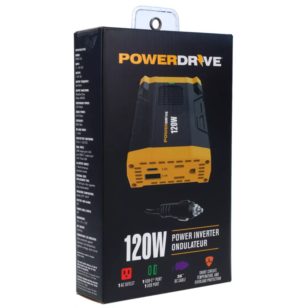 Keep the PowerDrive 120W power inverter in your car or truck to charge your phone and other small electrical devices while on the road. This slim design power inverter is able to power AC devices rated up to 100 watts with continuous power. You can power multiple appliances using the single AC outlet and 2 USB ports on this car inverter. Converts 12v to 110v. Battery to inverter cables are an ample 36 inches long. A great gift for travelers or anyone who tailgates and camps. Use this DC to AC cigarette lighter socket adapter to power small appliances and laptops and more. Perfect for on-the-go. Surge power is 250 watts. This power inverter comes with short circuit and temperature protection plus overload protection for peace of mind.- 120W continuous power - powers AC devices like a lamp or laptop up to 120 watts
